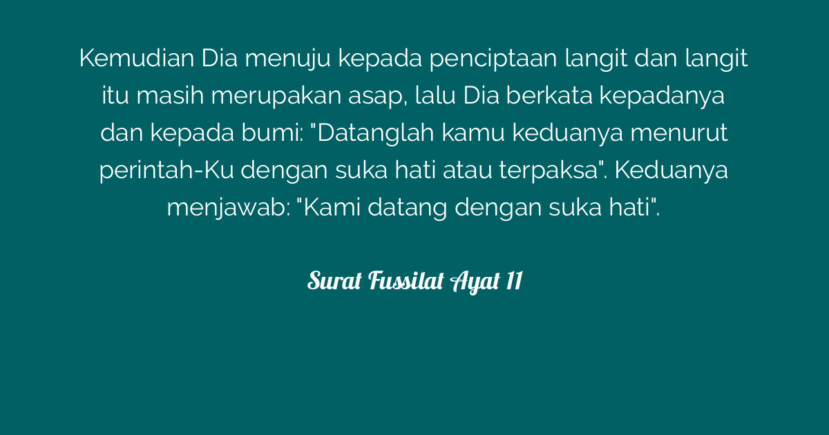 Inilah surah fussilat verse 11 Come both of you willingly or unwillingly They both said. We come willingly 12. Then He rose over Istawa ila the heaven when it was smoke and said to it and to the earth. Cek jugasurah dan surah fussilat verse 11 Then He aimedtended to the skyspace and it is smokefumes so He said to it and to the earthPlanet.